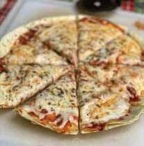 10. Once you are properly sauced, apply a nice fresh coat of the shredded mozzarella. Don’t do a huge amount of cheese on top though because the pizza won’t cook evenly. (Pro-tip: Add more cheese to the layer in between the tortillas for more cheesy goodness if desired).